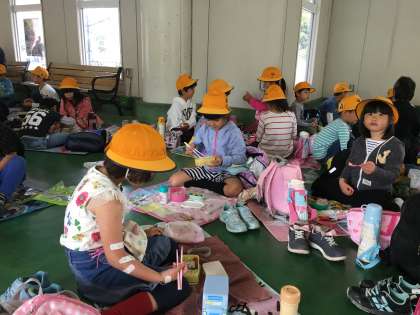 屋根のある場所をお借りして、みんなで昼食をとっています。