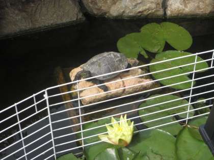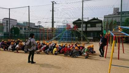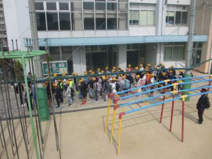 学校の池の亀が気持ちよさそうに甲羅干しをしています。素晴らしい天気のもと、5年生は錦織公園へ6年生は弥生博物館へ向けて出発しました。