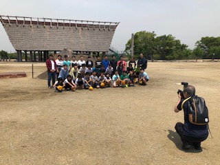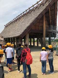 6年遠足〜竪穴住居や高床倉庫をバックに記念撮影〜