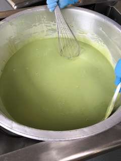 まっ茶ういろうは、白いんげんペースト・上新粉・まっ茶・砂糖・水を混ぜ合わせ焼き物機で蒸しています。