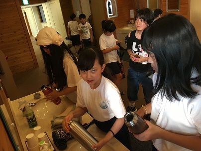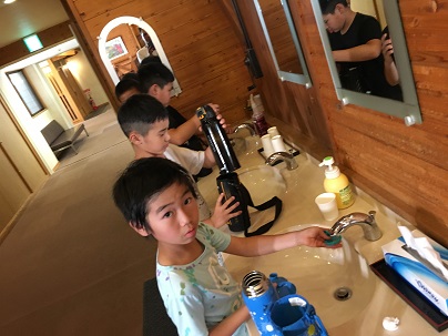 お風呂待ちの各部屋で、水筒を洗っています。
