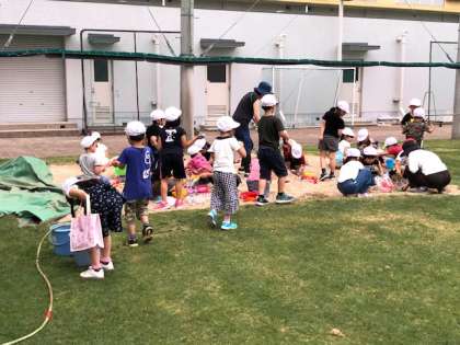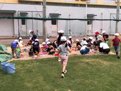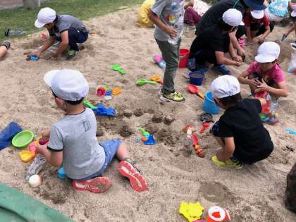 運動場の北西の隅にある砂場から、うれしそうな歓声があがりました。覗いてみると1年生がそれぞれバケツやスコップなどをもって、砂場でいろいろなものを作っていました。