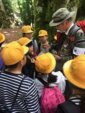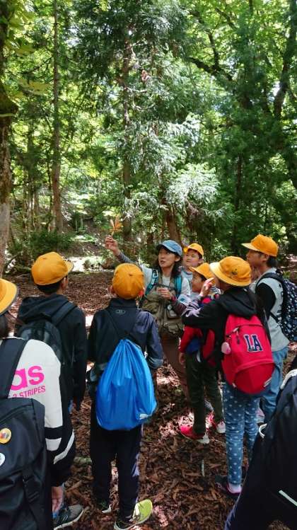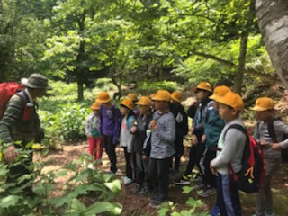 「森の中はひんやりと涼しく気持ちよかったです。木の上に大きなカエルの卵を見つけたり小さい紫陽花の花をルーペで観察したり、源流の川を渡ったりしました。芦生の森の植物についても色々教えていただきました。トチの木とカツラの木と杉の木は大きくて立派でした。出発前は小雨がぱらついたりしましたが、お天気ももってくれて雨に降られずで散策できました。帰りのバスで雨が降ってきました。」