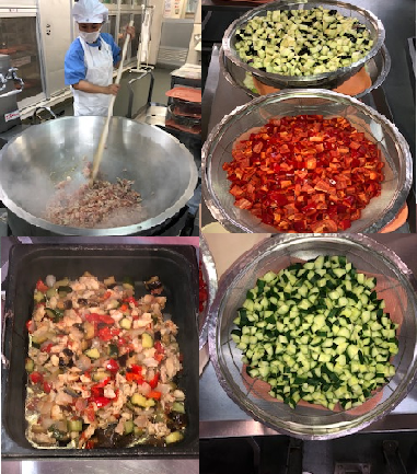 鶏肉と夏野菜のソテーは旬の食材のなす・きゅうり・年1回使用できる赤ピーマンをオリーブ油でソテーしワインビネガーでさっぱりした味付けにしています。