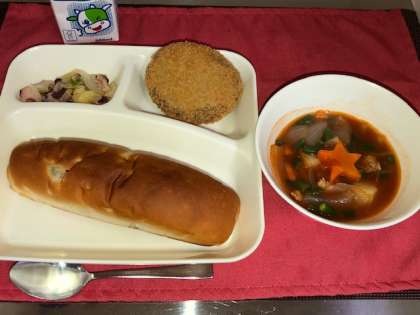 ケチャップ煮にはハートや星のラッキーにんじんが入っていました。