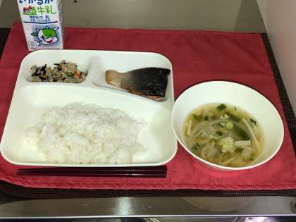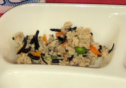 高野どうふのいり煮は粉末の高野どうふを豚ひき肉・にんじん・ひじきと一緒に出汁・砂糖・塩・うす口しょうゆの味つけで煮ています。ごはんによく合う1品です。