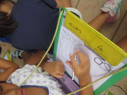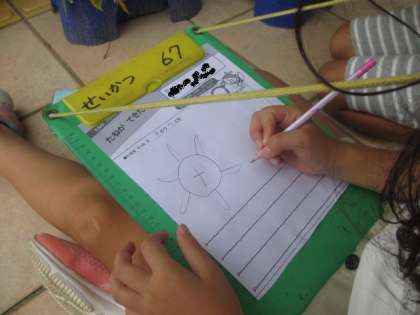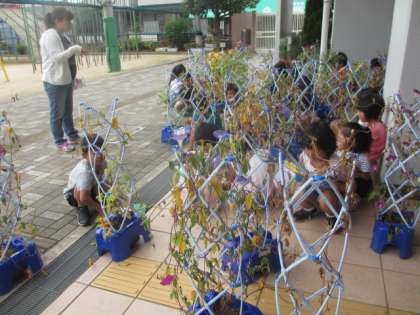 1年生の生活科の授業です。1学期に植えて、毎日水やりをして、大切に育てたあさがおはそろそろ花も咲き終わり、種がたくさんできています。1年生はそのあさがおの様子をスケッチしていました。