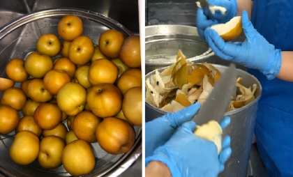 梨には20世紀等の皮が黄緑色の青梨と皮が褐色の赤梨とがあり、きょうの梨は豊水(赤梨)でした。豊水は幸水よりも1回り大きく糖度も高く果汁が多いのが特徴です。夏バテ疲労回復に役立つアミノ酸の1つアスパラギン酸が多く含まれています。
