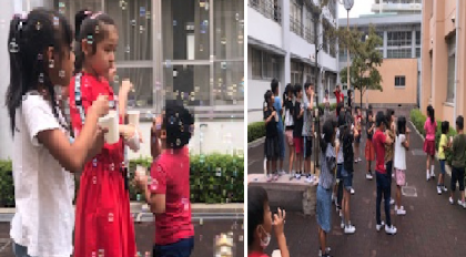 「みんなで仲良くシャボン玉であそぼう」で中庭でクラス皆でシャボン玉をしていました。大きなシャボン玉を作ったりみんなで一斉にとばしたりと綺麗な泡が風に流されとんでいました。