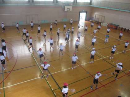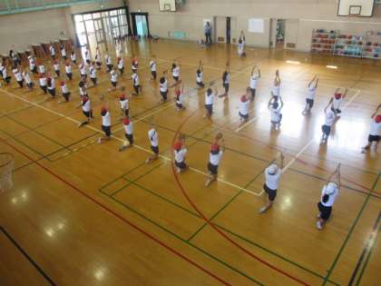 4年生は体育館で運動会の演技の練習をしました。4年生はエイサーをします。沖縄の伝統芸能です。「ハーイーヤー イーヤーサーサー」の掛け声が響いていました。
