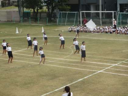 運動場で応援団の練習をしました。団長を中心に、児童席全体での応援となります。気持ちのこもった応援を当日は見てください。