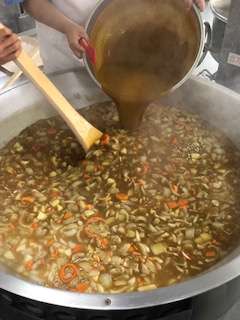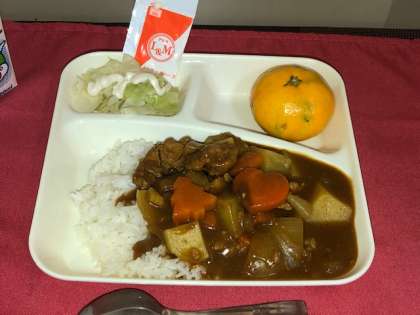 ポークカレーライスにはハートやツリーのラッキーにんじんがたくさん入っていました。カレールゥの素は小麦粉不使用の米粉でつくられています。