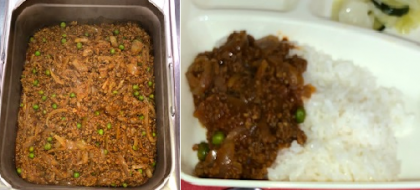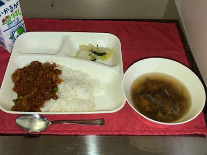 タコライスはタコスの具材をごはんの上にのせた沖縄県の料理です。給食では牛・豚ひき肉と玉ねぎをにんにくでいため塩・こしょう・カレー粉・トマトピューレ・ケチャップ・ウスターソースで味付けし最後にグリンピースを加えたスパイシーなタコミートをごはんにのせていただきました。児童にも大好評でした。