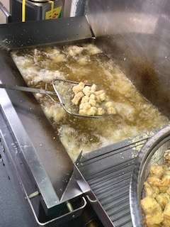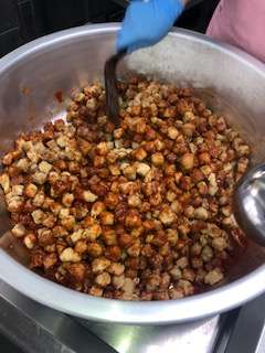 きょうのまぐろのオーロラ煮はでんぷんをまぶし揚げたまぐろにケチャップ・砂糖・赤みそを合わせ煮たソースであえています。児童にも大好評の1品です。