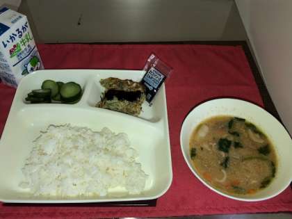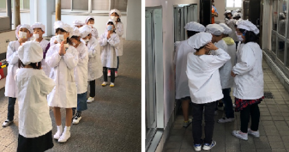 3枚目は給食を取りに来ている時の様子です。給食室前で、整列して「いただきます」をしてから給食室に入って調理員さんから手渡しで受け取っています。