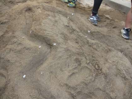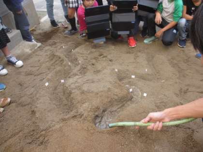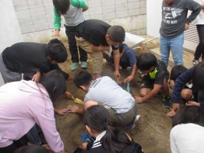 5年生は理科の実験で、タブレット端末を使い、水の流れを撮影し、水が流れた後の川の内側と外側の違いから、水の流れの強さを学びました。