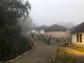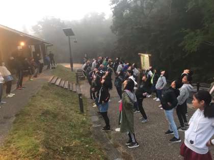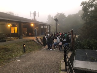 修学旅行は2日目の朝を迎えました。コテージの周辺は、少し冷え込んだようで、濃い朝霧につつまれ、幻想的な景色の中で活動が始まりました。