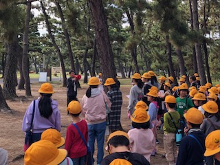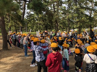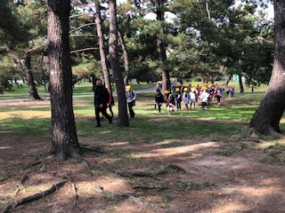 高学年に続き、中学年・低学年の子どもたちも浜寺公園に到着しました。校長先生のお話のあと、これから縦割り班でのオリエンテーリングを開始します。