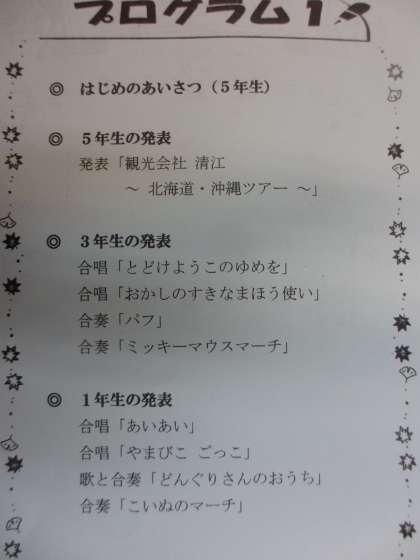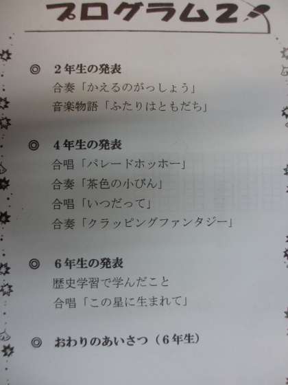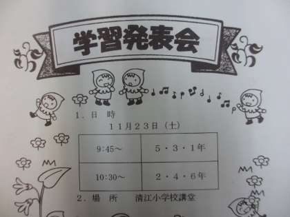 来週11月23日(土)は土曜授業です。学習発表会を行います。本日プログラムを配布しました。今こどもたちは一生懸命本番に向けて練習に取り組んでいます。お楽しみにしてください。