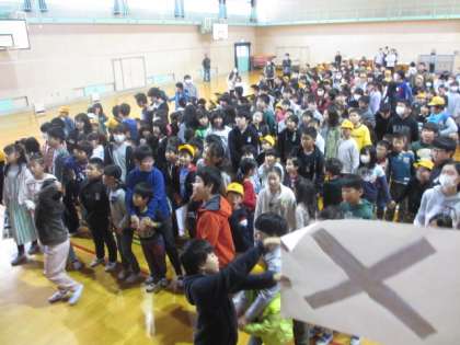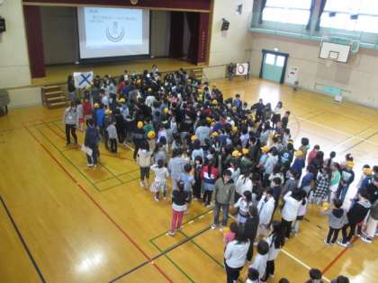 全校児童で、○×クイズを楽しみ、清江小学校の創立記念スライドショーを見ました。