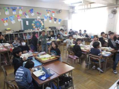 今日の給食は、1年生と6年生、2年生と4年生、3年生と5年生が学級の半数づつ移動して給食を食べる、他学年との交流給食でした。いつもと違う雰囲気に少し緊張しながらも、楽しく喫食することができました。