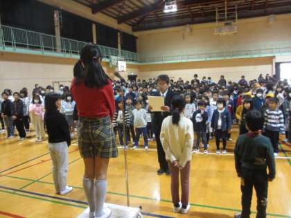 本日の朝会では大阪市青少年読書感想文コンクールで入賞した児童の表彰を行いました。読書をすると学習にも良い影響が出てきます。この冬ぜひこどもたちに読書の勧めをしてください。