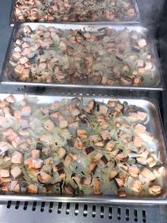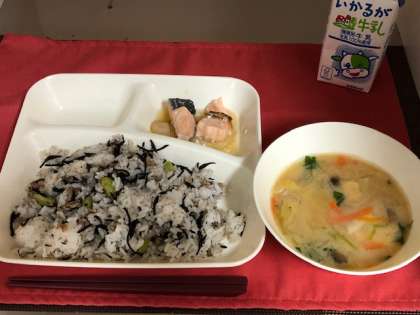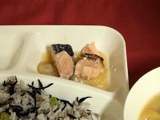平成30年度学校給食献立コンクール最優秀賞作品で昨年度小学校6年生の児童が考えた献立で【献立のねらい】は「色どりを意識して、見た目も味も食感も楽しんでもらう健康メニューを考えました」となっています。さけのさわやかレモン焼きは生のレモンを絞ったレモン汁と料理酒・みりん・うすくちしょうゆを合わせたタレを焼き物機で焼き上げた角切りのさけとたまねぎにかけています。程よく酸味のきいたさっぱりした味でした。