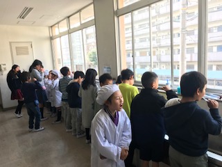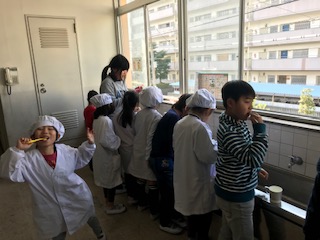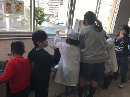 ブクブクうがい週間も中日をむかえ、はみがきをする人数を増やそうと、今日からは保健委員会の6年生が1年生と一緒にはみがきをしに行っています。