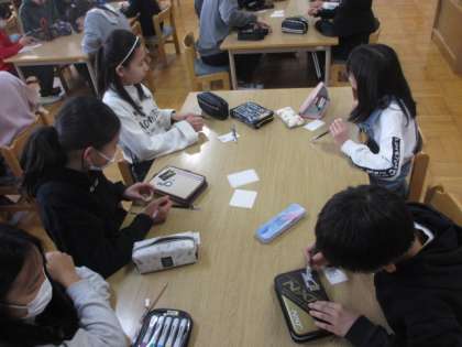 本日、6年生は5・6限にはぐくみネットワークのみなさんの協力で、消しゴムはんこを作成しました。下絵を描き、消しゴムに写し、彫刻刀で型どおりに彫りました。