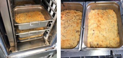 押麦のグラタンは鶏肉を主材に押麦を使用したホワイトソース(バター使用)のグラタンです。大好評でした。