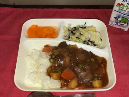 ハヤシライスのルゥは学校での手作りです。綿実油と小麦粉を使用し褐色になるまでいためています。
