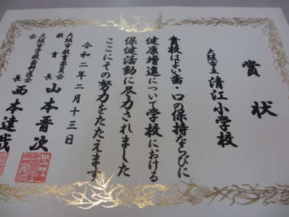 本日の全校朝会で、大阪市学校歯科医会から、清江小学校の保健活動が、よい歯・口の保持ならびに健康増進について表彰され、校長先生からお話がありました。
