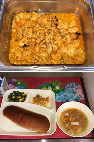 鶏肉のカレーマヨネーズ焼きは、鶏肉にニンニク・塩・カレー粉・こしょう・マヨネーズ・ケチャップを合わせ下味をつけ焼き物機でやきあげています。カレー風味がきいていて児童にも大好評でした。