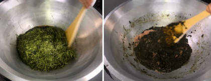 のりのつくだ煮はきざみのり・しいたけ(乾)を砂糖・料理酒・みりん・こい口しょうゆ・だし(しいたけの戻し汁も含む)で煮つめかつおぶし(砕片)を入れ更に煮つめています。給食室での手作りのつくだ煮です。ごはんによく合い大好評の1品です。