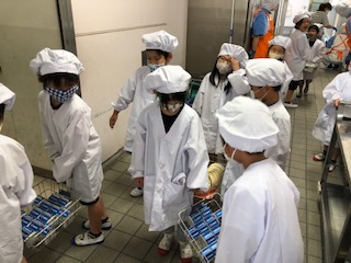 きょうは1年生がはじめて給食を給食室まで取りにきました。