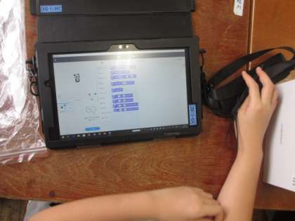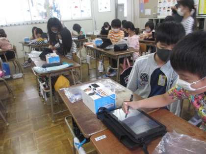 大阪市教育センターよりお借りしているロボットとタブレット端末を使って、子どもたちの手でプログラミングを行いました。