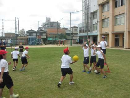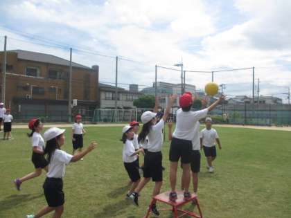 ルールはバスケットボールとほぼ同じで、ゴールには人が立っていて、台上でシュートしたボールをキャッチすれば得点となります。