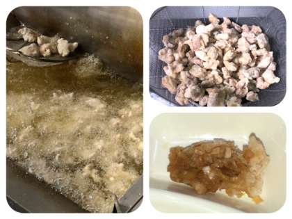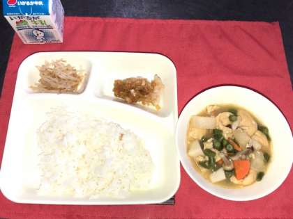 あげどりのねぎだれかけ……しょうが汁で下味をつけでんぷんをまぶし揚げた鶏肉に白ねぎ・砂糖・米酢・こい口しょうゆ・水を煮最後にごま油を加えたねぎだれをかけています。児童にも大好評でした。