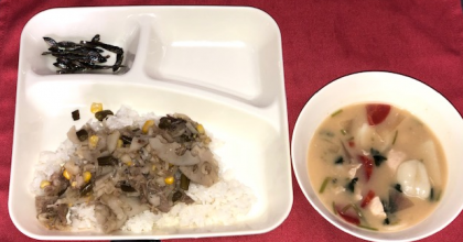 れんこんのちらしずしは各自皿の上でごはんと具材をまぜあわせるようになっています。それにきざみのりが1人1袋つきました。