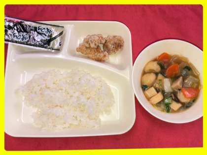 きょうのからあげはしょうが汁・にんにくで下味をつけて、でんぷんをまぶしてあげています。