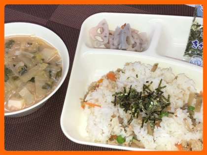 鶏ごぼうごはんは各自のお皿で混ぜ合わせ、きざみのりをかけて食べます。