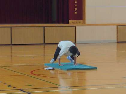 4月20日(火)、4年2組は講堂で体育科「マット運動」をしていました。先生が手本を見せています。