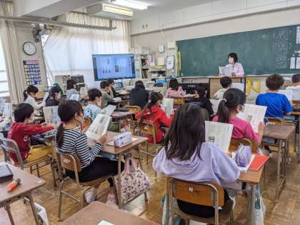 4月30日(金)、4年1組の様子と管理作業員さんが芝生を手入れしていただいている様子です。いつもありがとうございます。