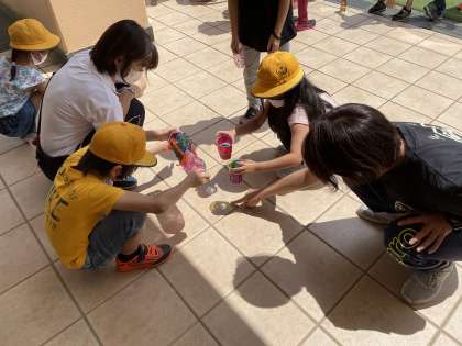 6月3日(木)、今日の2年生の図工は、「ひかりのプレゼント」という題材です。透過性のある材料に日光を当て、色々な色や形を楽しむというものです。まずは、色セロハンや透明折り紙が日光を通すとどのようになるか、色々試してみます。子どもたちは何も言わなくても、重ねたり友だちと協力して色々な形にしてみたりと様々な活動をしました。こういうときの子どもたちの発想は素晴らしいものがあります。