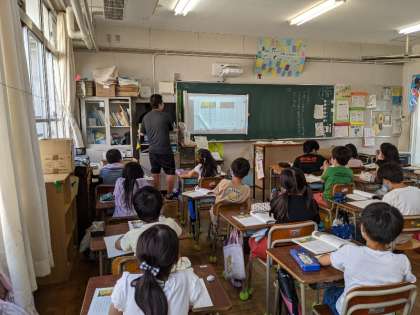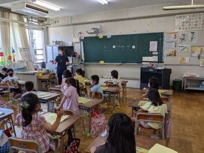 6月10日(木)、1年1組では音楽科「ともだちといっしょにおどりましょう」の単元を学習していました。リズムにのって楽しく動いていました。