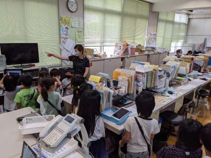 6月11日(金)、1年生は学校内の施設をたんけんしました。校長室や職員室、給食室、保健室などをたんけんしました。