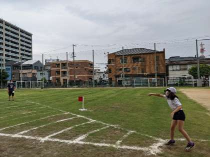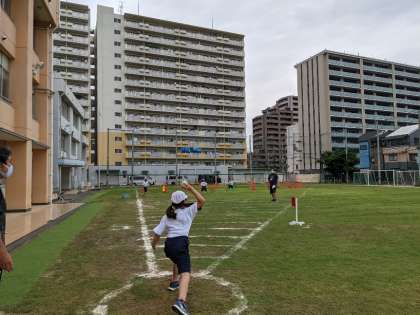 6月18日(金)、3年1組がスポーツテストでソフトボール投げをしていました。