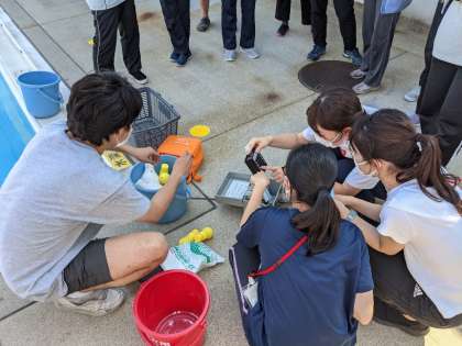 6月23日(水)、来週から水泳学習が始まります。放課後教職員が研修を行いました。水質の塩素濃度を調べている様子です。