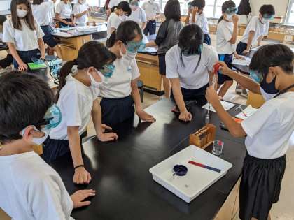 9月24日(金)、6年1組では理科「水よう液と金属」の学習で実験をしていました。金属にうすい塩酸を加えたときの変化を調べました。