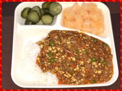今回は、カルシウム、鉄分、食物繊維などの栄養素が豊富に含まれているひきわり大豆も合わせて使用しています。ルゥは、小麦粉の代わりに米粉を使用したものを用い、小麦アレルギーのある児童も食べることができるように配慮した献立となっています。